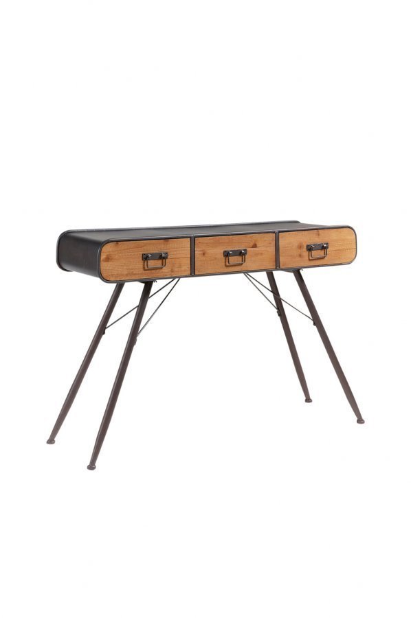 Sivupöytä, jossa metallirunko. Laatikot jalokuusta, jossa antiikkikäsitelty pinta. Korkeus 75 cm Leveys 120 cm Syvyys 38 cm