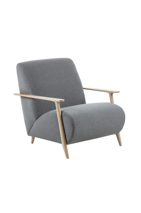 Pehmustettu käsinojallinen tuoli, jossa Teflon®-pinnoitettu tahroja hylkivä kangas. Käsinojat luonnonväristä saarnia. Korkeus 78 cm Leveys 77 cm Syvyys 86 cm