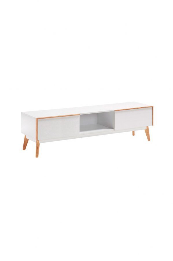 TV-taso valkoiseksi maalattua MDF-levyä. Jalat, runko ja vetimet tammea. Korkeus 45 cm Leveys 150 cm Syvyys 42,5 cm