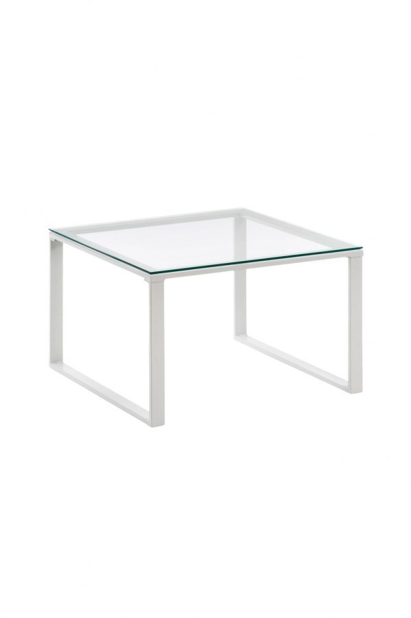 Sohvapöytä, jonka jalat ovat epoksimaalattua terästä. Pöytälevy läpinäkyvää, karkaistua lasia. Korkeus 38 cm Leveys 60 cm Syvyys 60 cm