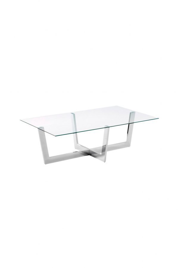 Sohvapöytä, jonka jalat ovat krominväristä terästä. Pöytälevy läpinäkyvää, karkaistua lasia. Lasin paksuus 8 mm. Korkeus 38 cm Leveys 120 cm Syvyys 70 cm