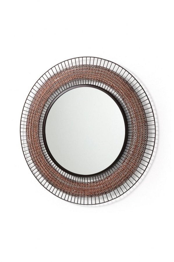 Pyöreä peili, jossa kehys kuparinväristä ja mustaa metallia. Korkeus 90 cm Leveys 90 cm Syvyys 2 cm