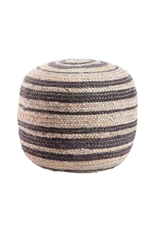 Pyöreä rahi vaaleanharmaata ja mustaa juuttia. Kiinteä päällinen. Toppaus mukana. Korkeus 40 cm Leveys 45 cm Syvyys 45 cm