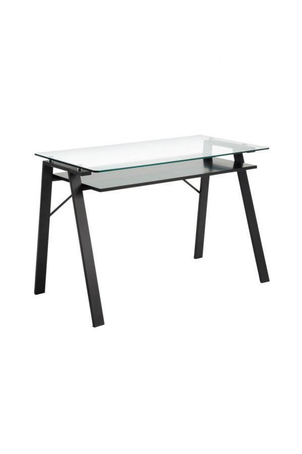 Kirjoituspöytä, jossa runko maalattua metallia ja levy karkaistua lasia. Korkeus 78 cm Leveys 120 cm Syvyys 62 cm