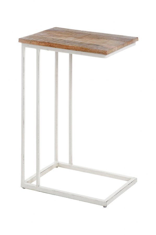 Sivupöytä, jossa metallirunko ja mangopuinen levy. Patinoitu pinta. Korkeus 65 cm Leveys 45 cm Syvyys 35 cm