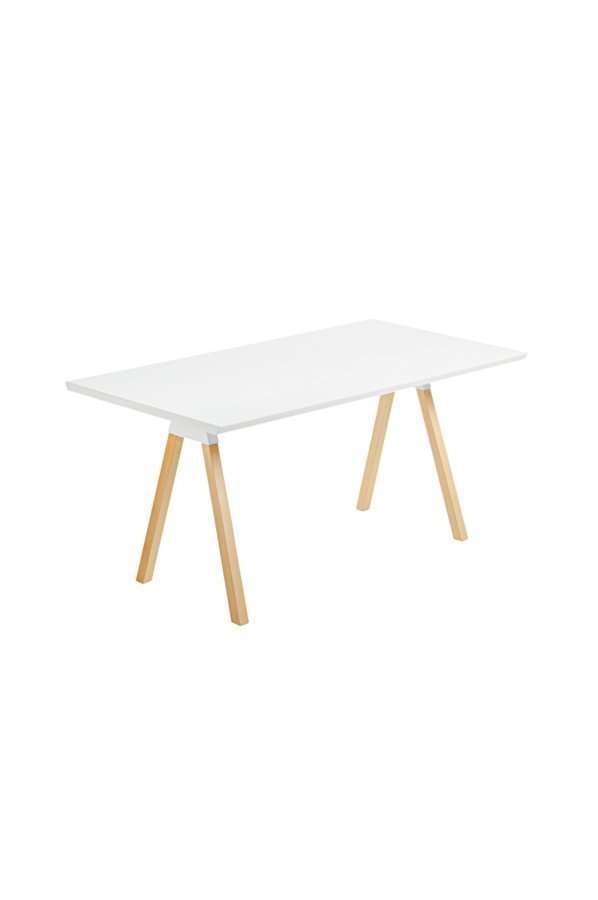 Pöytä pohjoismaista tyyliä. Valkomaalattu pöytälevy puukuitua ja luonnonväriset jalat saarnia. Korkeus 76 cm Leveys 180 cm Syvyys 90 cm