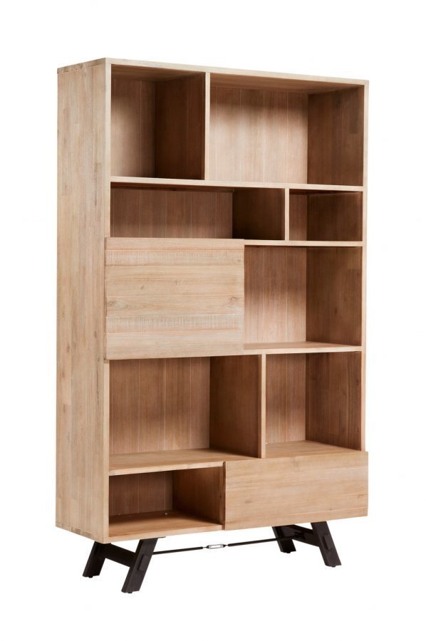 Kirjahylly valkaistua luonnonväristä akasiapuuta. Jalat patinoitua metallia. Korkeus 195 cm Leveys 120 cm Syvyys 40 cm