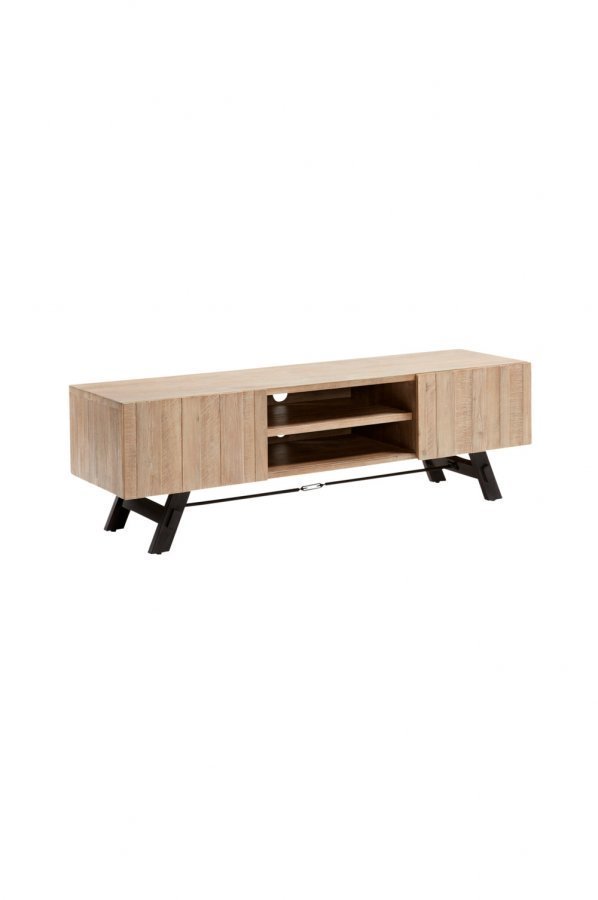 TV-taso akaasiapuuta, valkaistu luonnonvärinen. Jalat patinoitua metallia. Korkeus 50 cm Leveys 160 cm Syvyys 45 cm