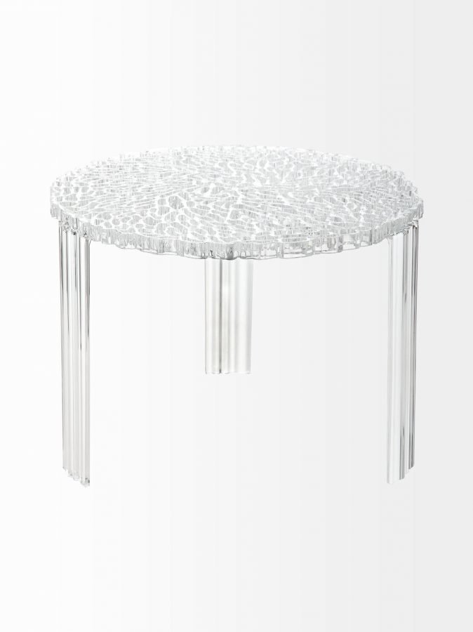 Patricia Urquiolan suunnittelema akryylipöytä on eteerisen läpinäkyvä ja samalla hauskan koristeellinen. Sopii myös ulkokäyttöön.