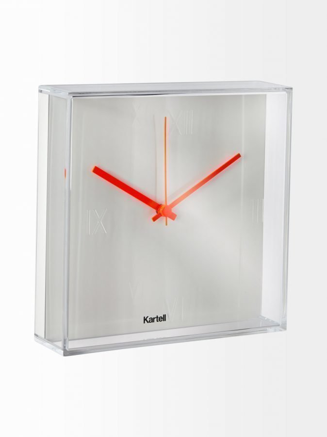 Ajattoman tyylikäs seinäkello on Philippe Starckin käsialaa. Kestävästä muovista valmistetun laatikon sisällä on tehostevärinen kellotaulu. Kello toimii yhdellä AA-paristolla, joka kuuluu pakkaukseen. Mitat ovat 30 x 30 x 8 cm.