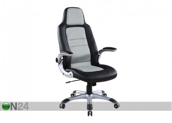 Työtuoli on verhoiltu mustalla keinonahalla ja harmaalla kankaalla – istuinkorkeuden säätö kaasupumppumekanismilla -… Lue lisää »