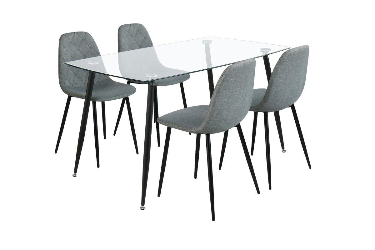Moderni Koo-pöytäryhmä sis. siron lasipöydän ja 4 kangasverhoiltua harmaata tuolia. Lue lisää ja tilaa!