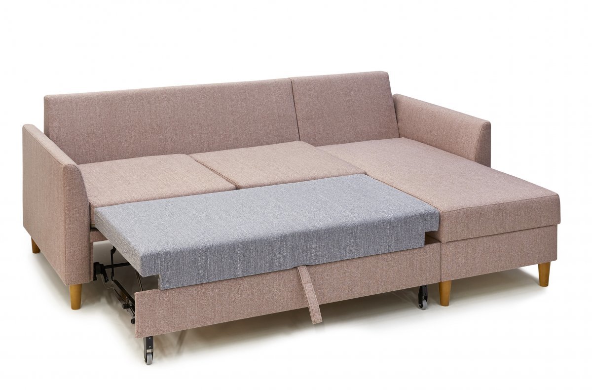 Koodi Saaga -vuode/kulmadivaani on verhoiltu huonekalukankaalla. Reilunkokoinen varavuode. Tilaa!