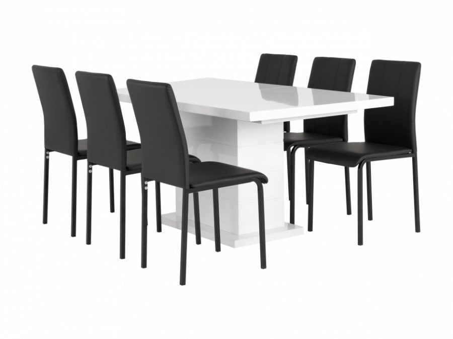 Ruokailuryhmä, joka koostuu valkeasta jatkettavasta pöydästä ja kuudesta tuolista. Valitse itse haluamasi väri. Pöydän mitat:… Lue lisää »