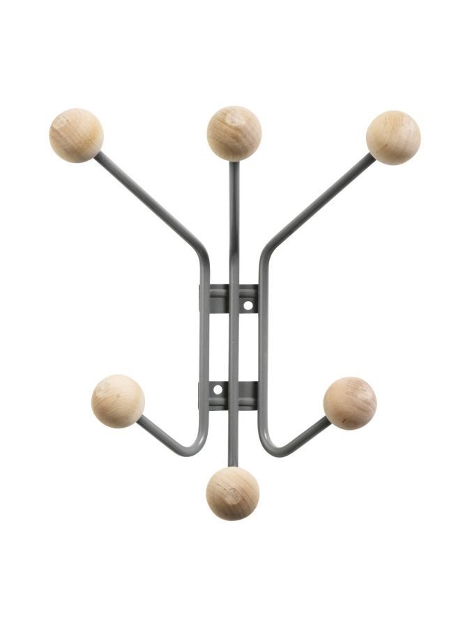 Pelkistetyn tyylikäs naulakko sopii moneen tilaan. Yhdistele muihin sarjan säilytysratkaisuihin. Materiaali on mattalakattua metallilankaa, päätypallot ovat puuta.
