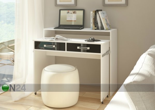 Kirjoituspöytä on valmistettu laminoidusta kalustelevystä – pöytäosa liukuu metallikiskoilla ja pienillä pyörillä -… Lue lisää »