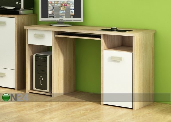 Tietokonepöytä on valmistettu melamiinipinnoitetusta kalustelevystä – laatikot ja näppäintaso liukuvat metallikiskoilla – oven… Lue lisää »