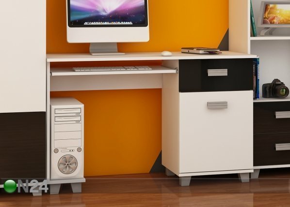 Tietokonepöytä on valmistettu laminoidusta kalustelevystä – laatikko ja näppäintaso liukuvat metallikiskoilla – oven… Lue lisää »