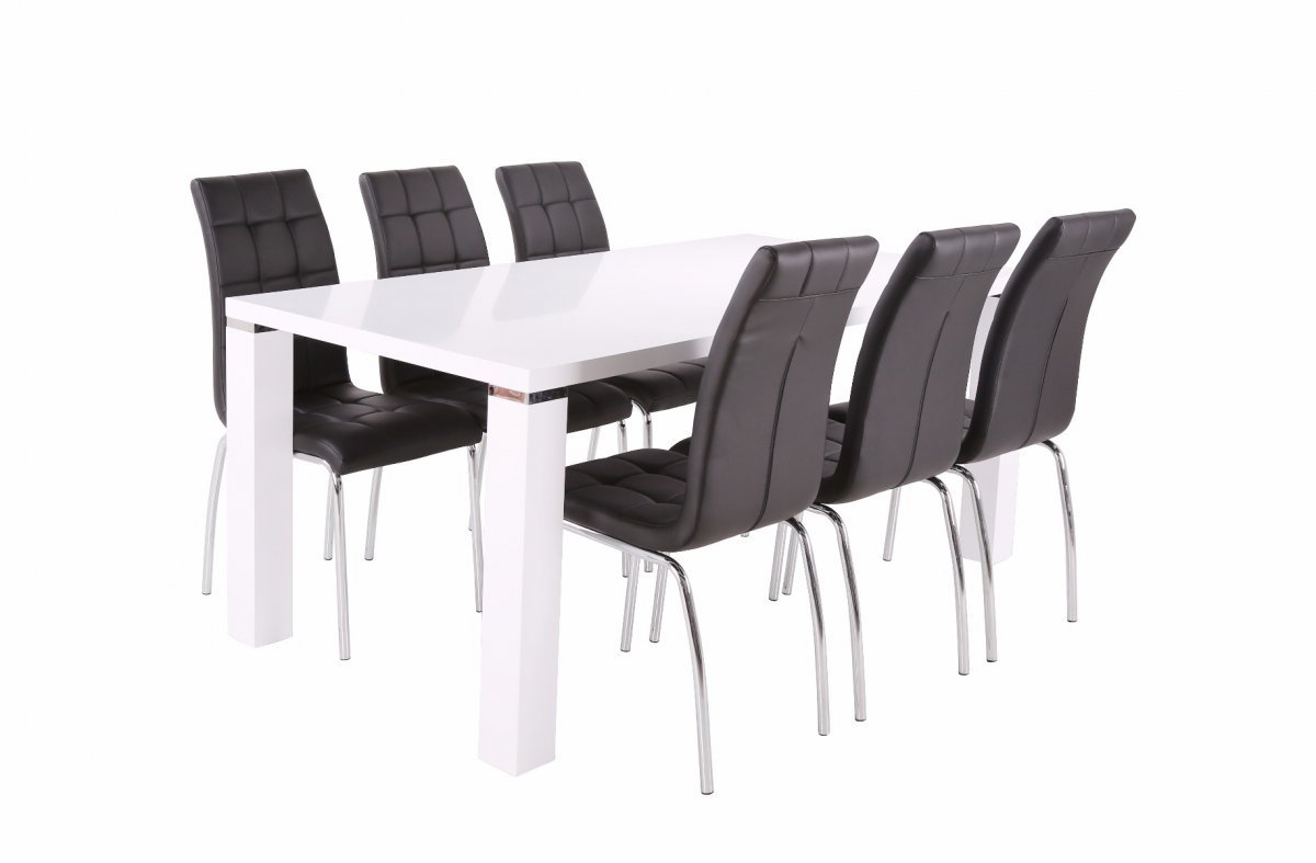 Metro-setissä on 180 cm pitkä ruokapöytä + 6 mustaa Krista-tuolia, joissa vaahtomuovipehmuste. Pöydässä maalattu valkoinen taso & kromikoristetut jalat. Tutustu!