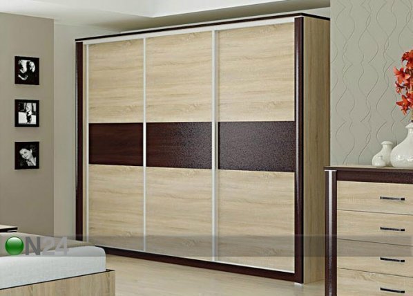 Liukuovinen vaatekaappi on valmistettu laminoidusta kalustelevystä – keskimmäisen oven takana on neljä hyllyä… Lue lisää »