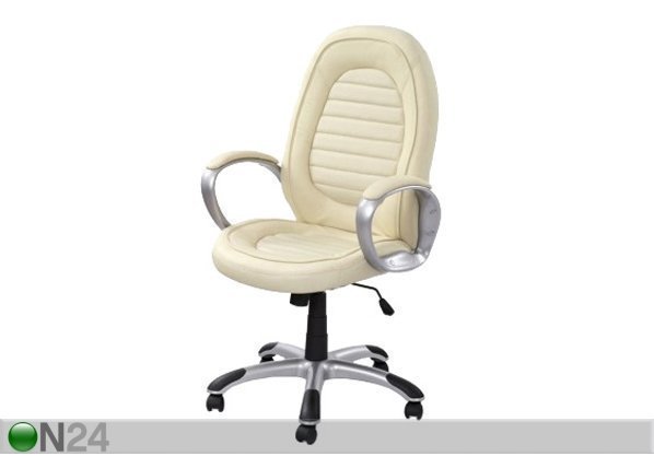 Työtuoli on verhoiltu beigellä keinonahalla – hopeansävyiset muoviset käsinojat on päällystetty keinonahalla -… Lue lisää »