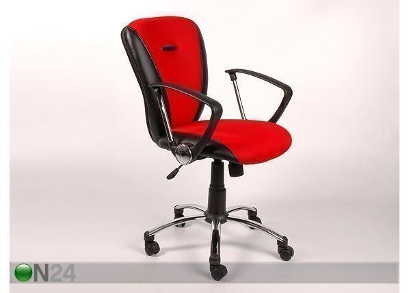 Tuolin istuimen ja selkänojan keskiosa on verhoiltu punaisella verkkokankaalla, reunoilla on mustaa keinonahkaa… Lue lisää »