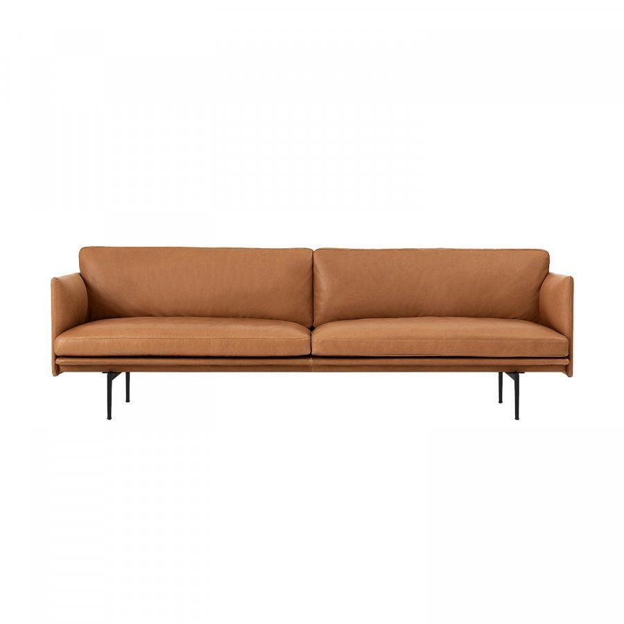 Outline 3-istuttava sohva merkiltä Muuto, suunnittelija Anderssen & Voll. Mukava sohva runsaalla istuimella ja designilla, joka kutsuu lepäämään. Runko koostuu pulverilakatuista teräsjaloista, kylmävaahdosta, puuraameista ja konjakin värisestä silkki nahasta, joka tekee sohvasta mukavan istua. Suorat linjat ja runsas istuin tekee nojatuolista vastustamattoman.