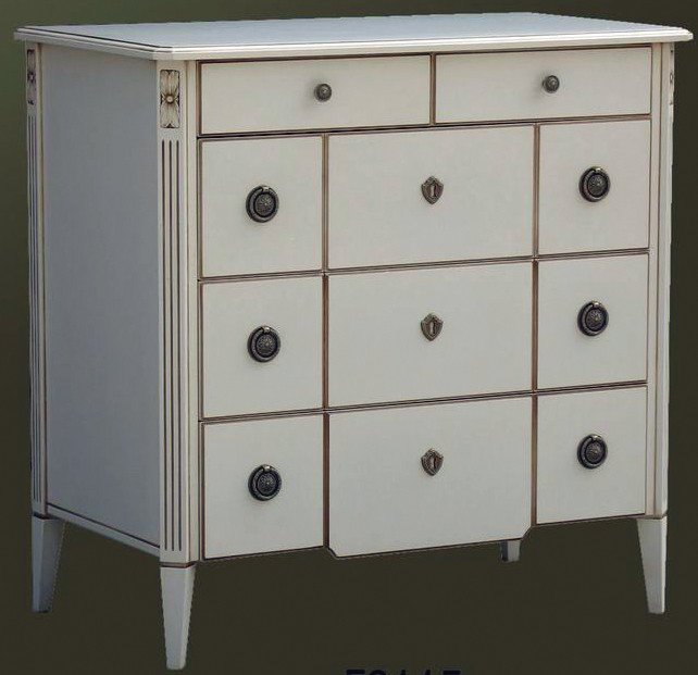 Tyylikkäässä antiikinvalkoisessa Nizza-15-lipastossa on 5 laatikkoa. Reunojen kullanväriset raidat tuovat ripauksen romantiikkaa.