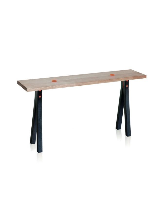 Minimalistisen tyylikkääseen penkkiin hauskan yksityiskohdan luovat kaksi pistettä. Materiaali on puuta ja metallia. Mitat ovat 90 x 20 x 45 cm.
