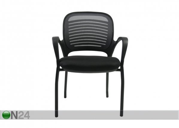 Metallirunkoisen asiakastuolin istuin on verhoiltu mustalla kankaalla – selkänojassa harmaa verkkokangas – käsinojat… Lue lisää »