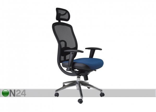 Työtuolin istuin on verhoiltu sinisellä ja selkänoja mustalla polyesteri verkkokankaalla – istuimen korkeus… Lue lisää »