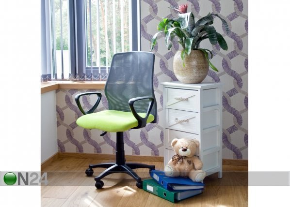 Työtuolin istuin on verhoiltu vihreällä kankaalla – selkänoja on verhoiltu harmaalla verkkokankaalla -… Lue lisää »