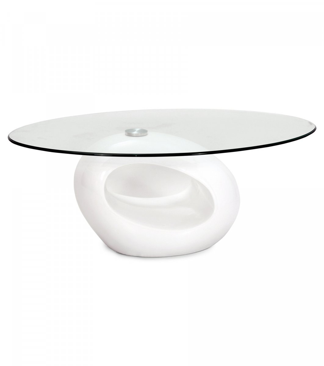 Pyöreässä Orfeo-sohvapöydässä on lasikansi. Valkoinen jalkaosa on muotoonvalettua lasikuitua, jossa High gloss -pinta. Tilaa sohvapöytä Hobby Hallista!