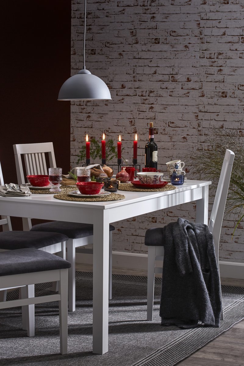 Sirolinjaisen Pohjanmaan Aamu -ruokaryhmän ääressä aterioi 4 ruokailijaa. Mukavat ja kestävät tuolit. Valkoinen.