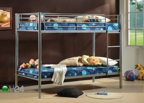 Metallirunkoinen kerrossänky – viimeistelty hopean sävyisellä maalilla – sängyn pohjat metallia – patjat… Lue lisää »