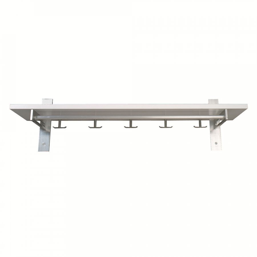 Valkolakattu hattuhylly alumiini koukuilla. Tyylikkään hyllyn jokainen yksityiskohta on korkealaatuista ja huolellista työnjälkeä.