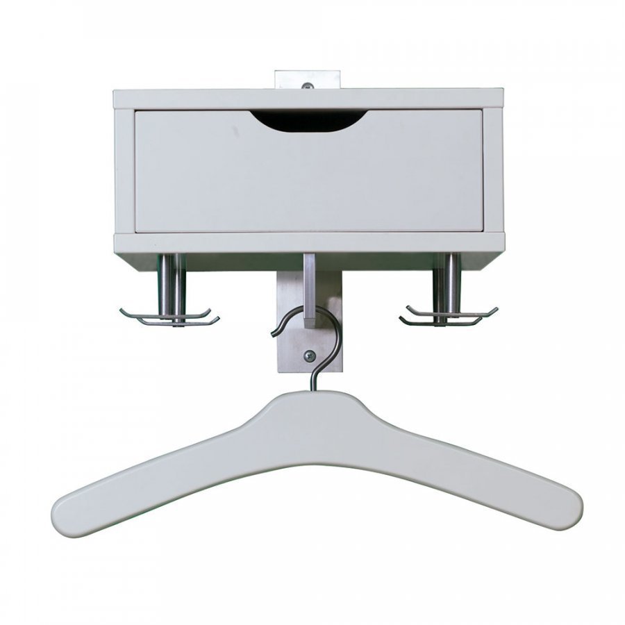Pienikokoinen hattuhylly, joka sopii pieniin tiloihin. Valkolakattu hylly alumiini koukuilla.