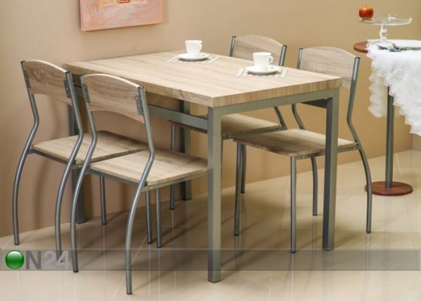 Ruokailuryhmään sisältyy pöytä ja neljä tuolia – valmistettu MDF-levystä, viimeistely: dab sonoma -… Lue lisää »