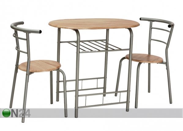 Ruokailuryhmään sisältyy ruokapöytä ja kaksi tuolia – pöydän kansi ja tuolien istuimet on… Lue lisää »