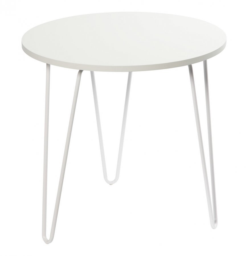 Pyöreä sivupöytä, jossa on valkoiset metallijalat. Pöytätason materiaali MDF, halkaisija 50 cm. Sivupöydän koko on 50 x 50 x 46,5 cm. Väri valkoinen.