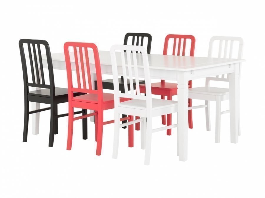 Valkoinen ruokapöytä ja kuusi ruokailutuolia. Valitse tuolien väri. Mitat pöytä: P180 L95 K75 cm…. Lue lisää »