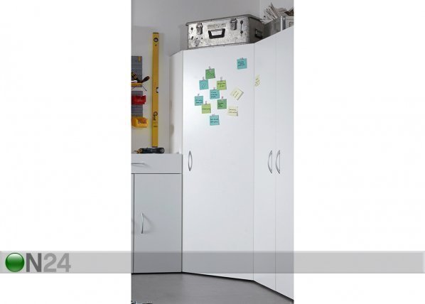 Kulmakaappi on valmistettu kalustelevystä – kaapin sisusta on harmaa – oven takana on… Lue lisää »
