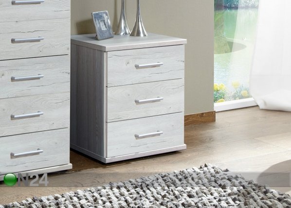Laadukkaasta kalustelevystä valmistetussa yöpöydässä on kolme laatikkoa – laatikot liukuvat metallikiskoilla, vetimet ovat… Lue lisää »
