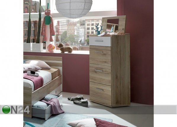 Lipastossa on neljä laatikkoa, valmistettu kalustelevystä – lipastossa on ylös nostettava peilitaso, jonka… Lue lisää »