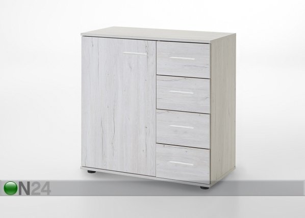 Kalustelevystä valmistetussa lipastossa on yksi ovi ja neljä laatikkoa – oven takana on… Lue lisää »