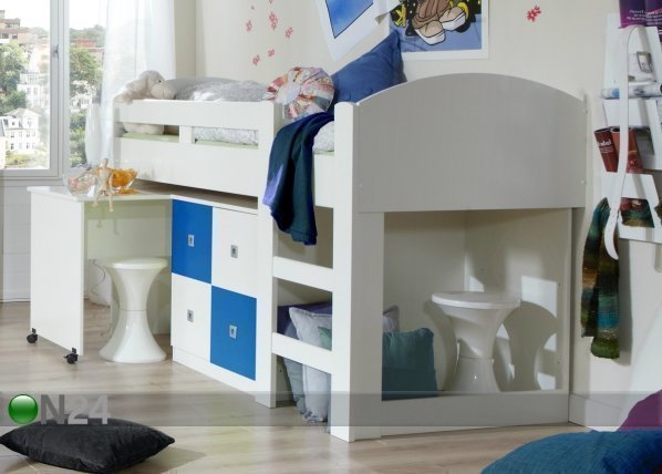 Ryhmään sisältyy parvisänky, kirjoituspöytä pyörillä ja lipasto – valmistettu valkoisesta kalustelevystä, lipaston ovissa… Lue lisää »