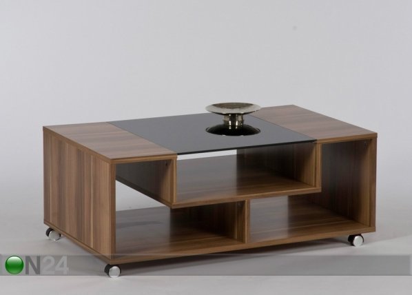 Kalustelevystä valmistetussa sohvapöydässä on pyörät – taso mustaa lasia – tuotettu Saksassa… Lue lisää »
