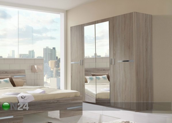 Neljäovinen vaatekaappi on valmistettu kalustelevystä, kahdessa keskimmäisessä ovessa on peili – kaapin sisusta… Lue lisää »