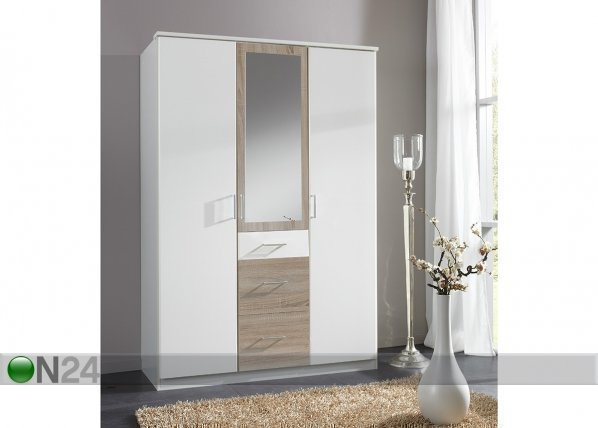 Kolmiovinen vaatekaappi on valmistettu kalustelevystä, keskimmäinen ovi on päällystetty peilillä – sisusta on… Lue lisää »