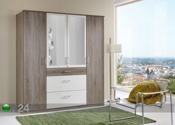 Neljäovinen vaatekaappi on valmistettu kalustelevystä, keskimmäiset ovet on päällystetty peilillä – sisusta on… Lue lisää »
